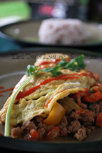 After remove fried omelet wrapper from the pan. Place stuffing full on half side of the omelet